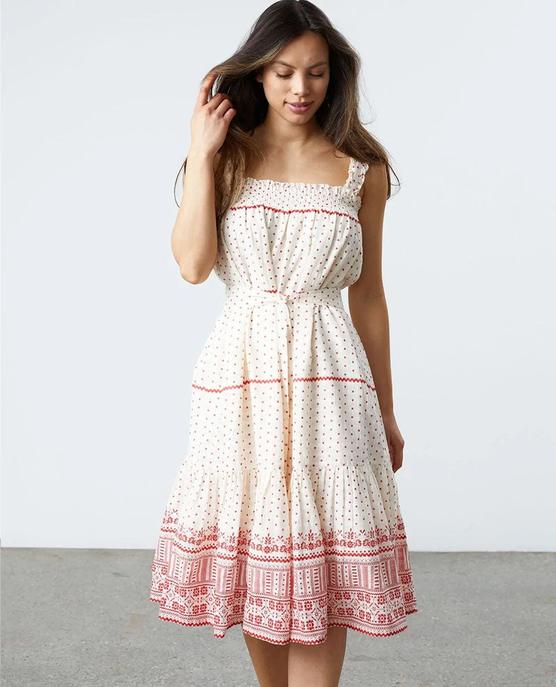 Lollys Laundry Tabitha Dot Dress, a white cotton sundress with thick straps and a smocked neckline. Either belt with the matching waist belt or leave loose for an airy and floaty vibe by the pool. Covered in a red spot print and finished at the hem with floral patterns the Tabitha midi dress also comes in a coral colourway.