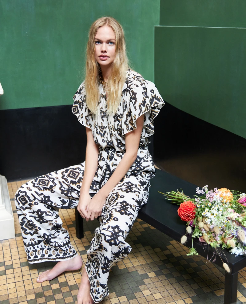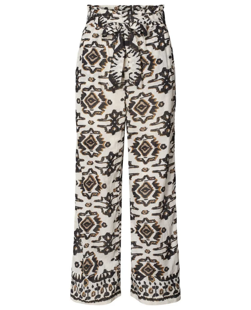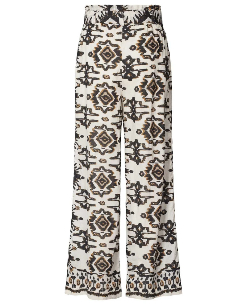 Lollys Laundry Vicky Aztec Print Pants, a fun patterned trouser with a 70s feel. The Vicky trousers have a comfortable, elasticated waist with removable band as well as a wide leg finish. Dress up or down!
