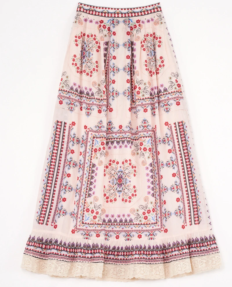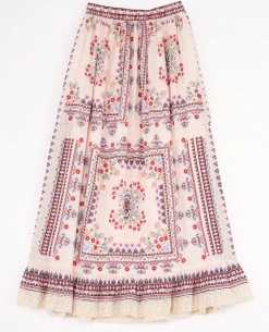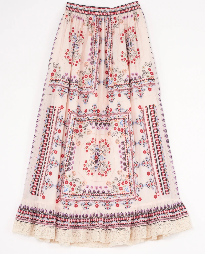 Mabe Eden Print Multicolour Maxi Skirt, a cotton silk maxi skirt with intricate detailing. With a rose pattern and geometric print, the Eden skirt has a relaxed and easy fit with wide cotton trim.