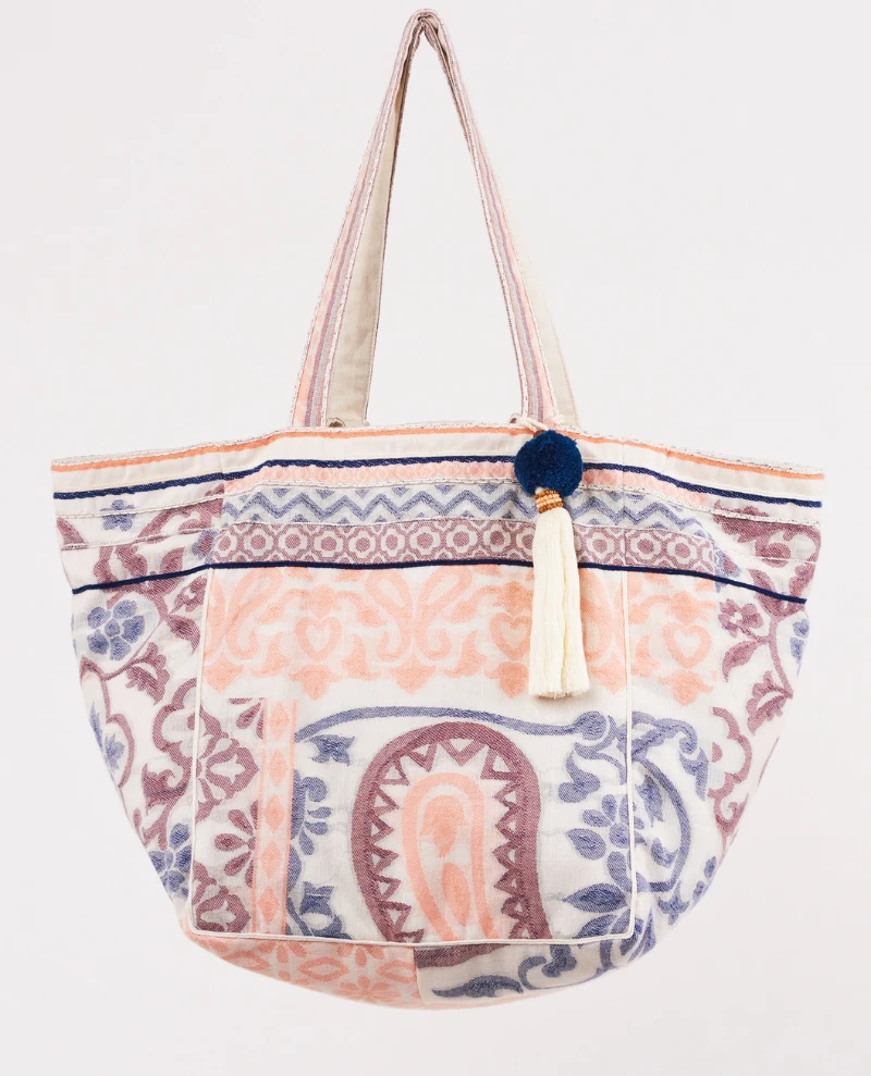 Mabe Neva Jacquard Tote, made from cotton and designed in a mosaic and boarder pattern the Neva Tote is detailed with a large pom pom and tassel trim and striped woven cotton lining. Its roomy size is generous enough to fit all your beach essentials.