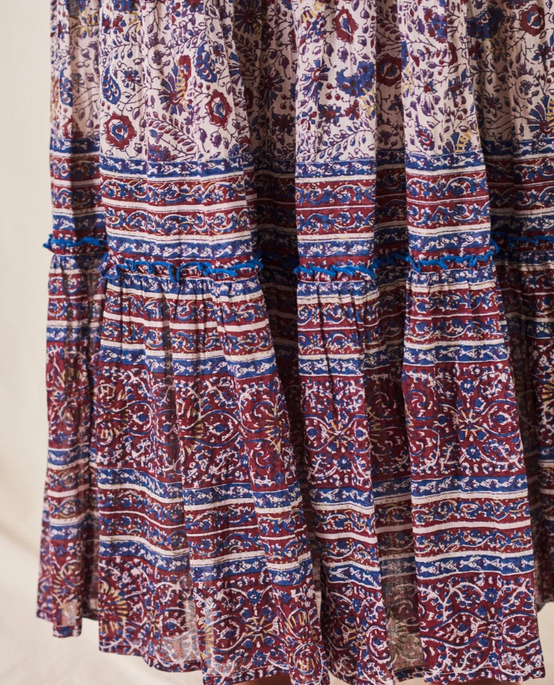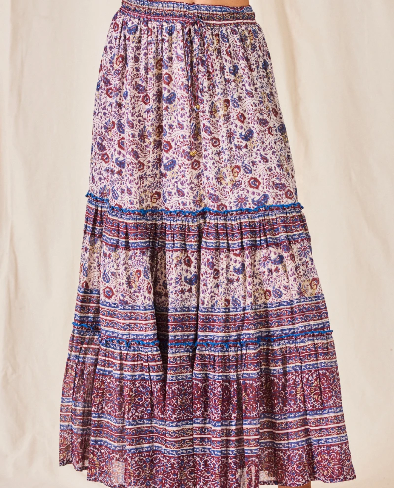 Mabe Rosa Print Multicolor Maxi Skirt, a long maxi style skirt in purple tones. With fine paisley style pattern, the Rosa skirt has tie t the waist for a relaxed fit and a lightweight, floaty feel.