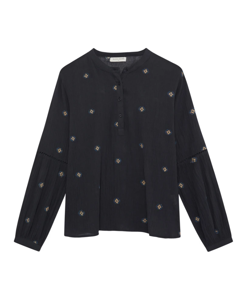 The Maison Hotel Zoe Petrol Blouse is a polished and versatile wardrobe piece for any occasion. Perfect for casual and professional looks alike, the blouse features a round neckline, long sleeves, and a half-button placket with contrast pattern. Crafted in soft and comfortable cotton, the timeless look is accentuated by the delicate lace inserts.