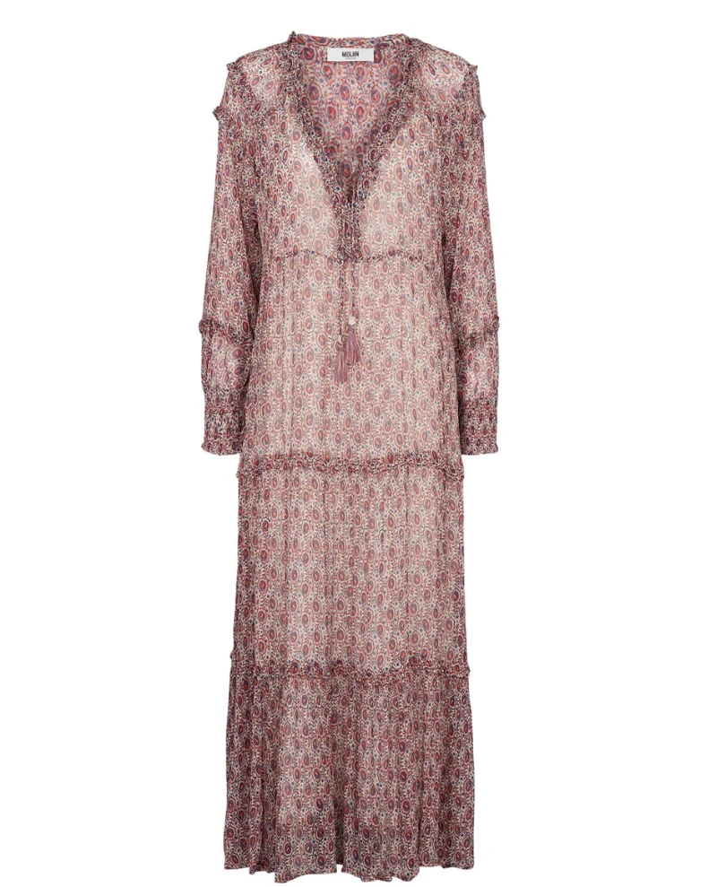 Moliin Alba Carmelia Rose Dress, a maxi style smock dress with ruffled v-neck and tassled string to the neckline. The Alba dress has long sleeves with ruffled shoulders and smock detail.