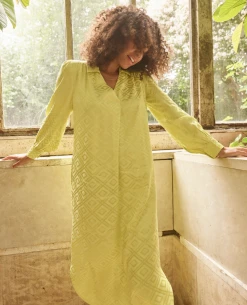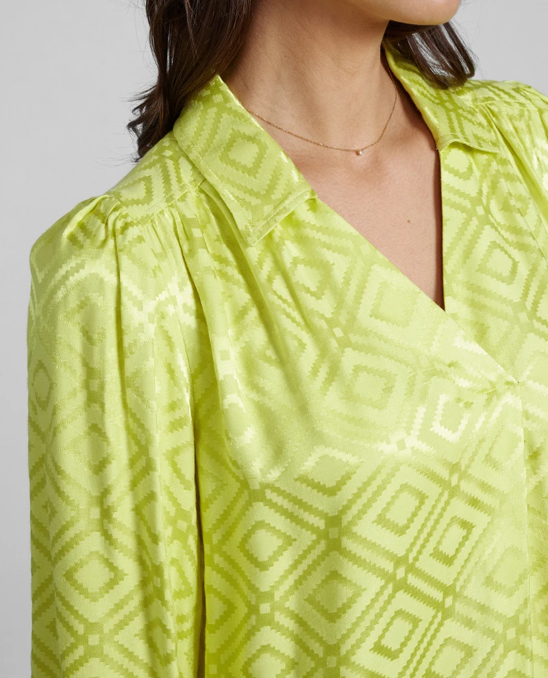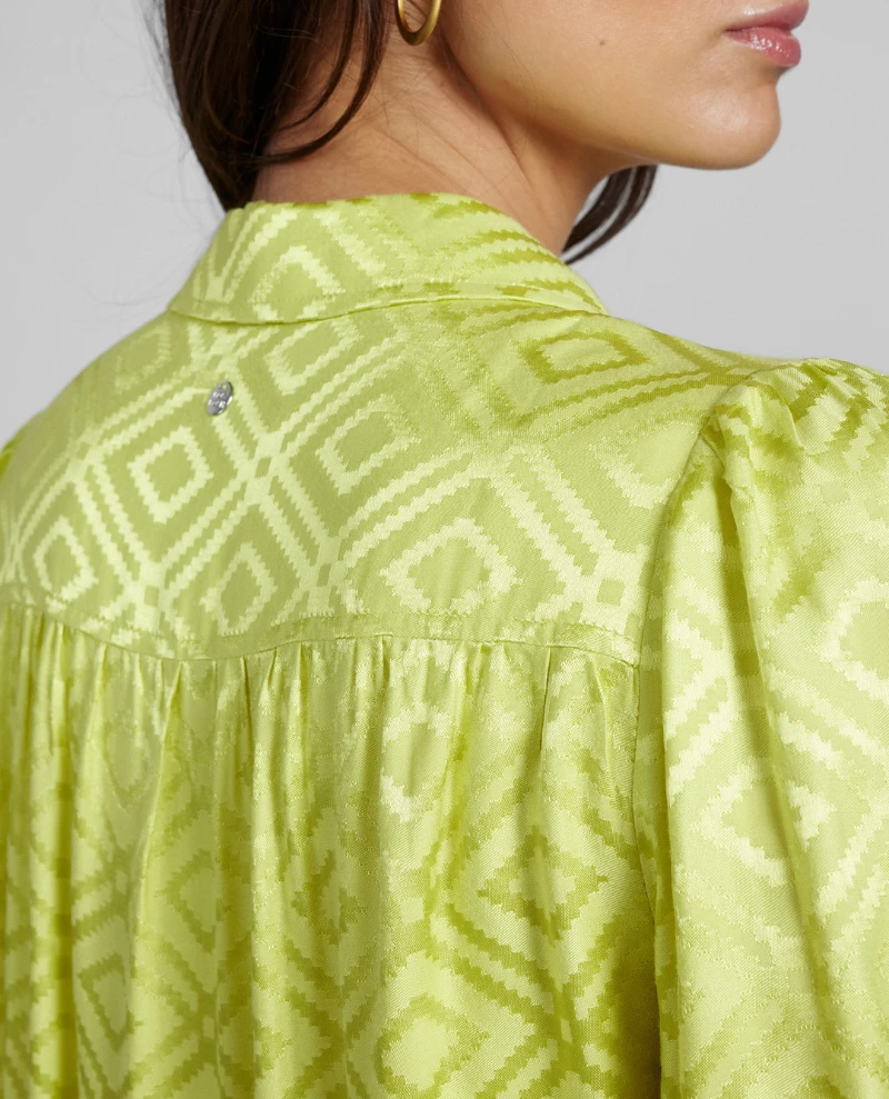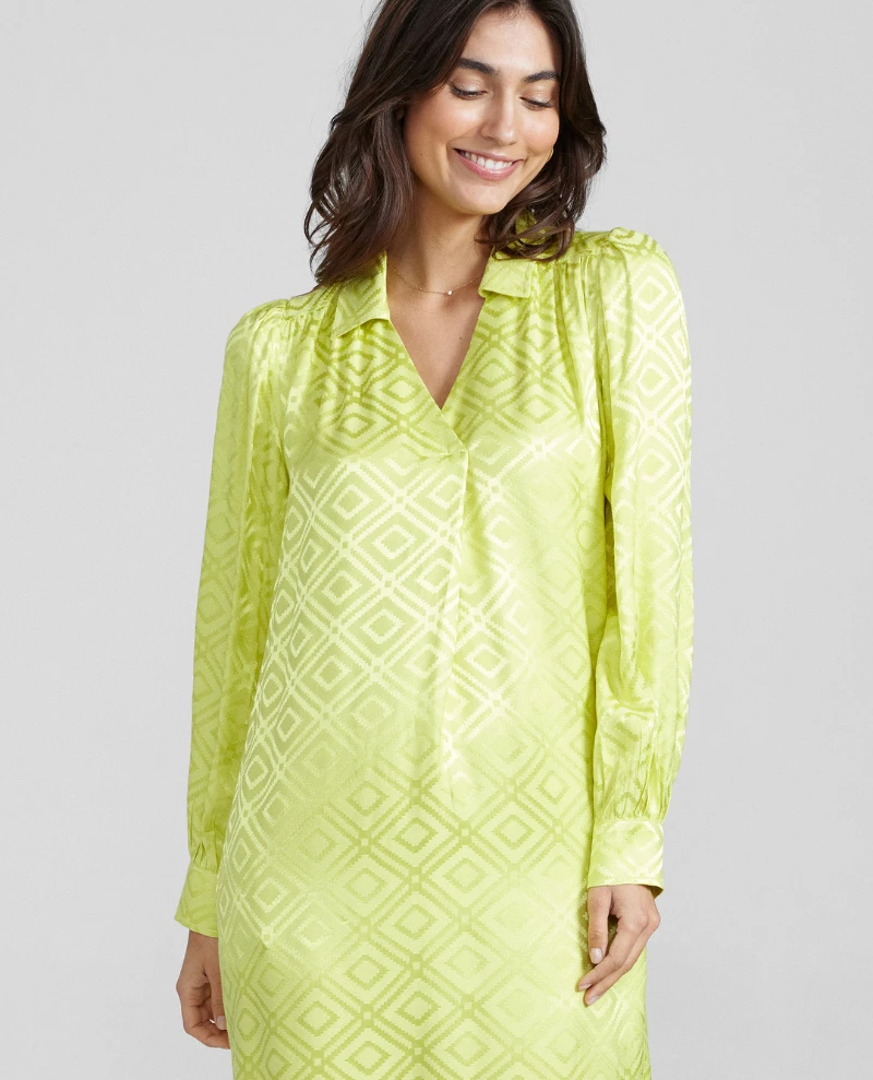 Mos Mosh Aldo Geo Yellow Plum Dress, a vibrant jacquard dress with a timeless silhouette. It’s designed in a slightly loose silhouette with long balloon sleeves, a curved hem, and soft pleat details at the front and the back. Style with sandals or boots for a cool and more casual look or heels for the perfect summer wedding or event look.