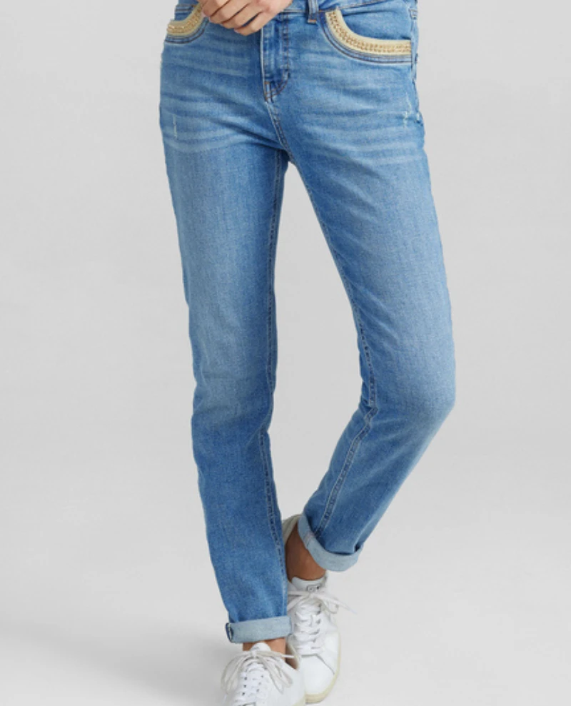 Mos Mosh Bradford Ave Jeans, a boyfriend fit with low/mid waist and plenty of stretch for daylong wear. They are finished with destroyed details and pyramid truck details on the front pocket. Try it with a cool statement tee, trainers or boots!