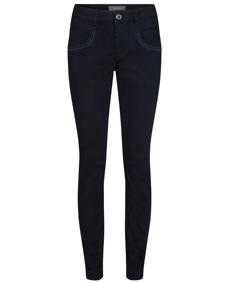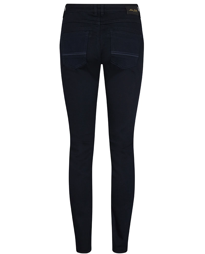 Mos Mosh Naomi Deep Blue Jeans, a deep navy blue pair of soft skinny jeans with a high waist and shiny silver metal button. The front and back pockets are finished with blue embroidered stitching.