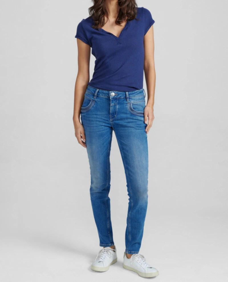 Mos Mosh Naomi Rostov Jeans, a slim legged jean in washed denim. These jeans are designed in a regular fit with a high/mid waist. They are finished with tone-in-tone blue decoration on the pockets, and we would wear them with a blazer and statement tee underneath.