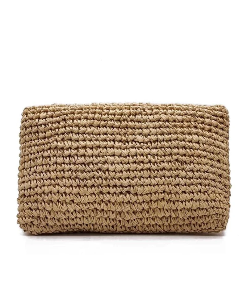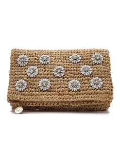 Nooki Abbie White Mix Clutch, a fold over raffia clutch. Featuring white enamel flowers which give it a jewel like quality. This is the perfect bag for a evening out.