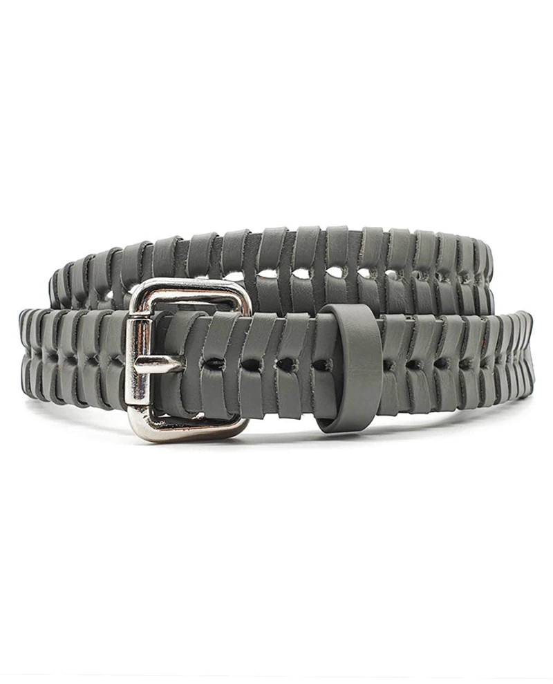 Nooki Bradley Grey Belt, a grey leather whipstitch belt with a gold buckle fastening.