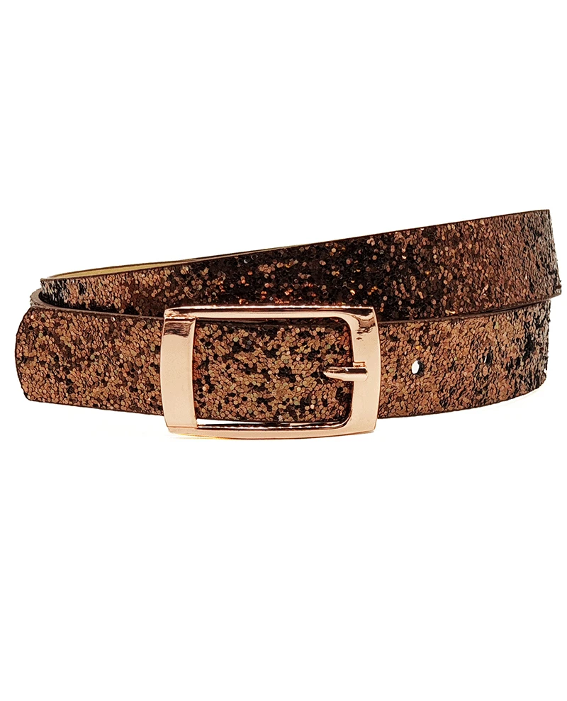 Nooki Hacienda Copper Glitter Belt, a glittering copper brown glitter belt with a shiny gold metal buckle.