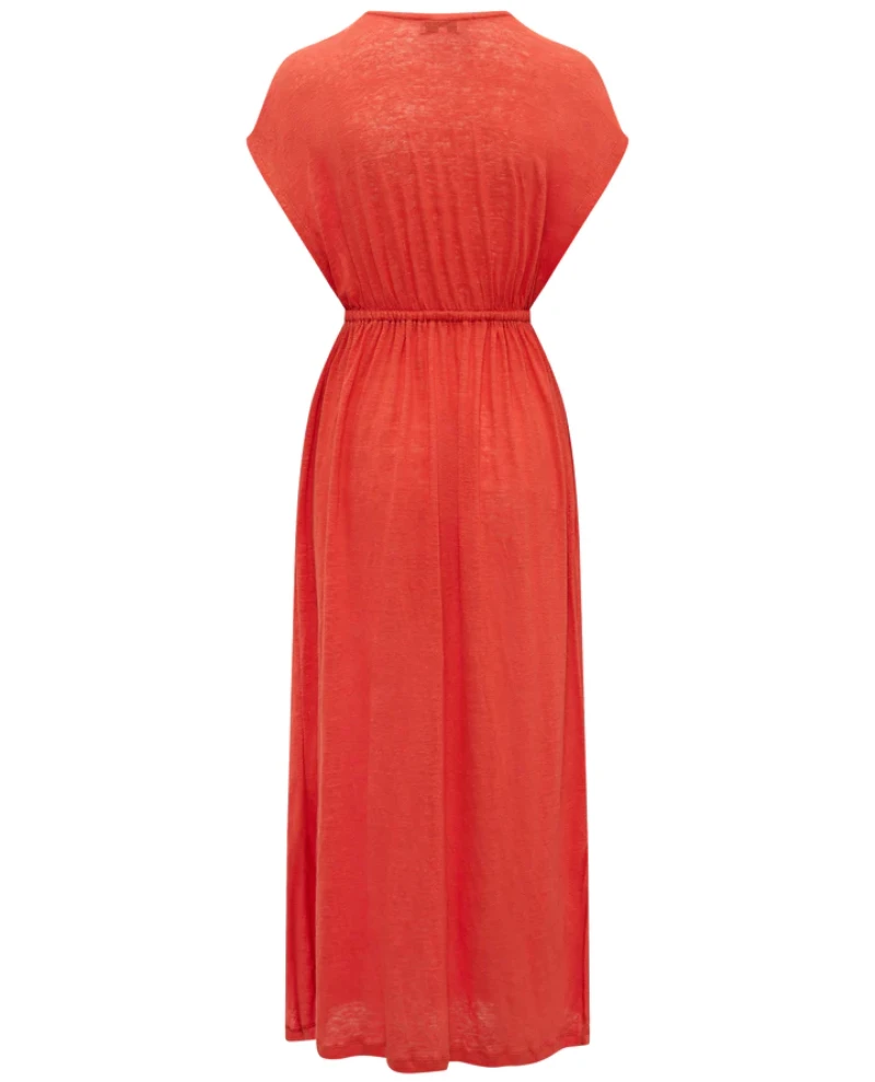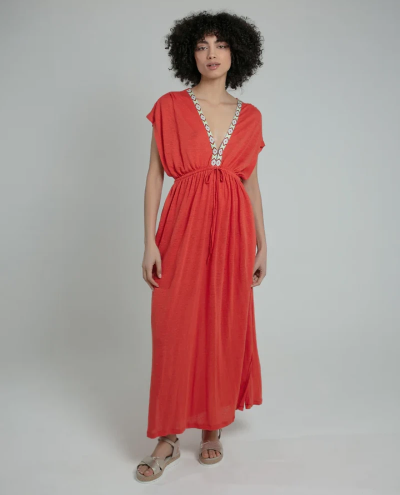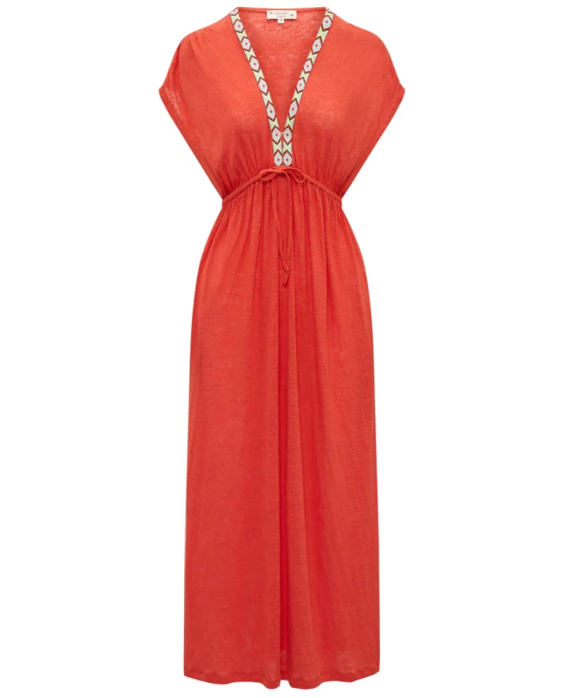 Nooki Lucia Orange Maxi Dress, a linen jersey dress with deep v-neckline and short sleeves. Finished in a bright orange tone, the Lucia dress has a fluid feel with decorative tape to the neckline.