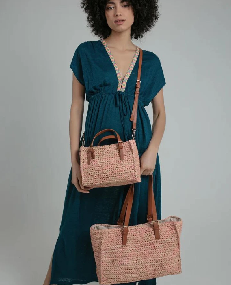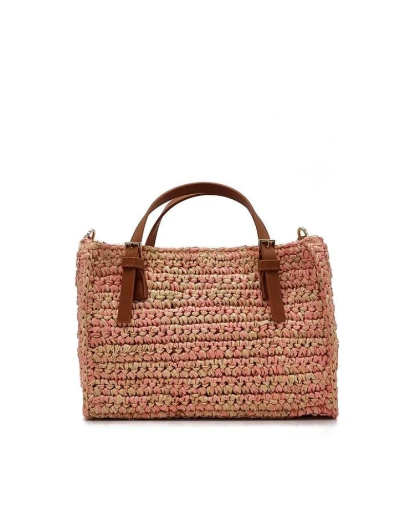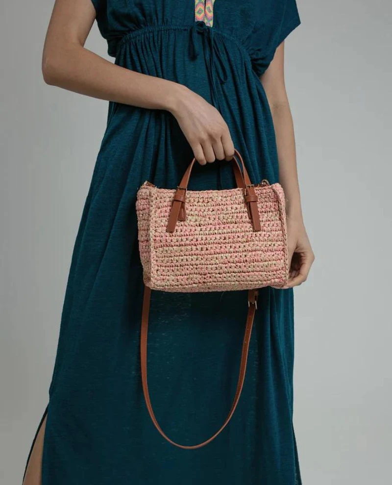 Nooki Maxine X Body Natural Pink Bag, a hand crocheted bag in pink. Playing on the mini bag trend, the Maxine has both brown leather hand held straps as well as a longer cross body strap. Complete with gold buckle detail.