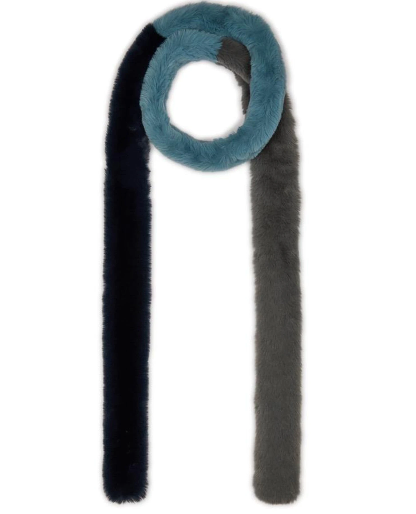 Nooki Pasha Duck Egg Scarf, a tri-colour thin scarf made from super soft fluffy faux fur. This long skinny scarf is made up from colour blocks of navy, blue and grey.