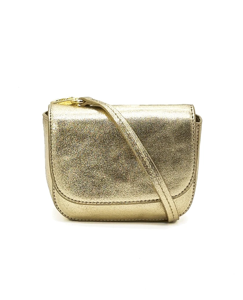 Nooki Portia Gold Necklace Bag, a shimmering gold metallic shoulder bag with a long adjustable gold strap.