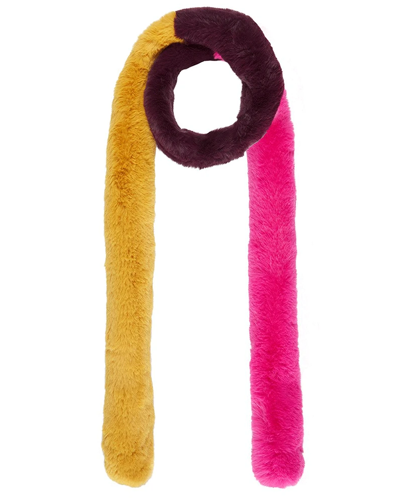 Nooki Pasha Pink Scarf, a tri-coloured skinny scarf made from super soft and fluffy imitation fur. This long thin scarf is made up from colour blocks of pink ,mustard and burgundy.