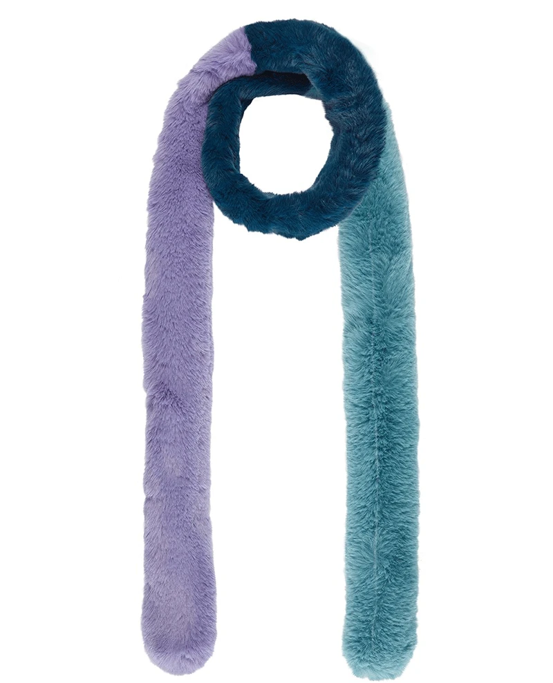 Nooki Pasha Lilac Scarf, a tri-coloured skinny scarf made from super soft and fluffy imitation fur. This long thin scarf is made up from colour blocks of lilac, blue and navy.