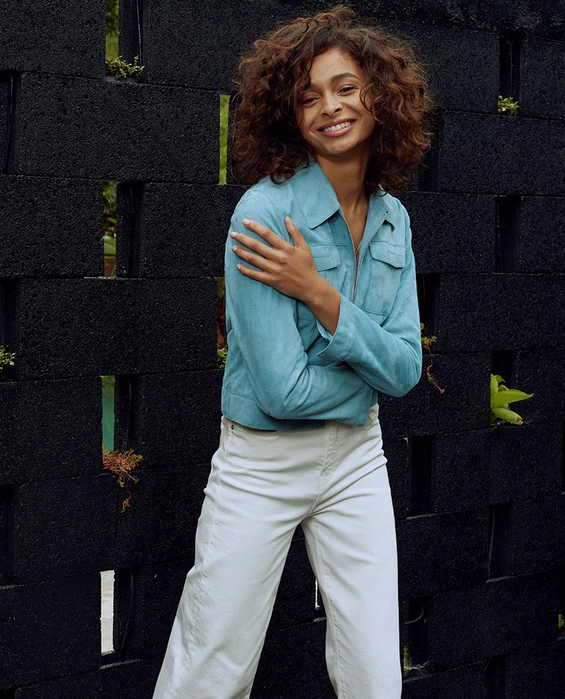 Oakwood Shake Blue Jacket a light powder blue jacket with long sleeves and a pointed collar. This soft suede jacket fastens down the front with a silver metal zip and features two chest pockets with flat closures. Wear this short boxy style over Summer dresses or with jeans for a casual weekend look.