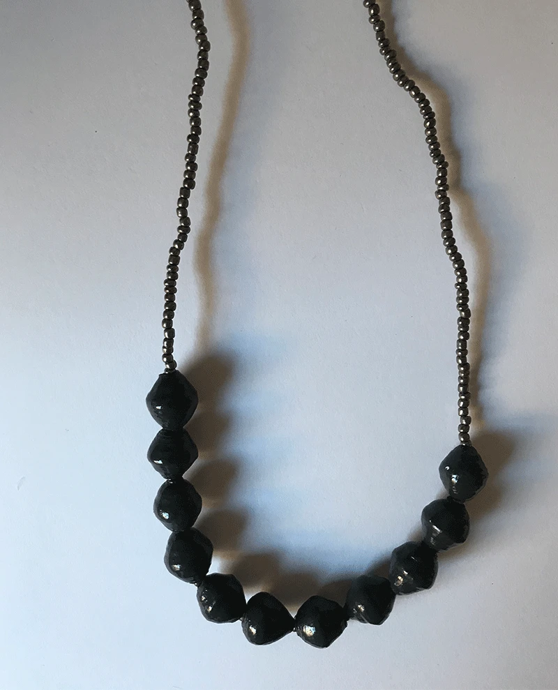 Varnished Paper Beads, a long metallic anthracite colour beaded chain that can be worn long or doubled up. Choose from pink, charcoal or grey beads made from varnished paper.