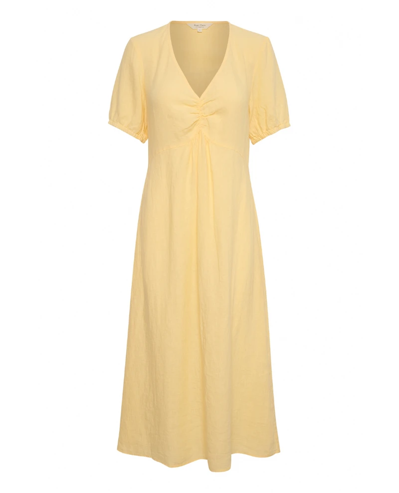 Part Two Althea Mellow Yellow Dress, a v-neck sundress with short, elasticated sleeve and floaty skirt. In a soft yellow tone, the Althea has shaping at the bust for a flattering fit.