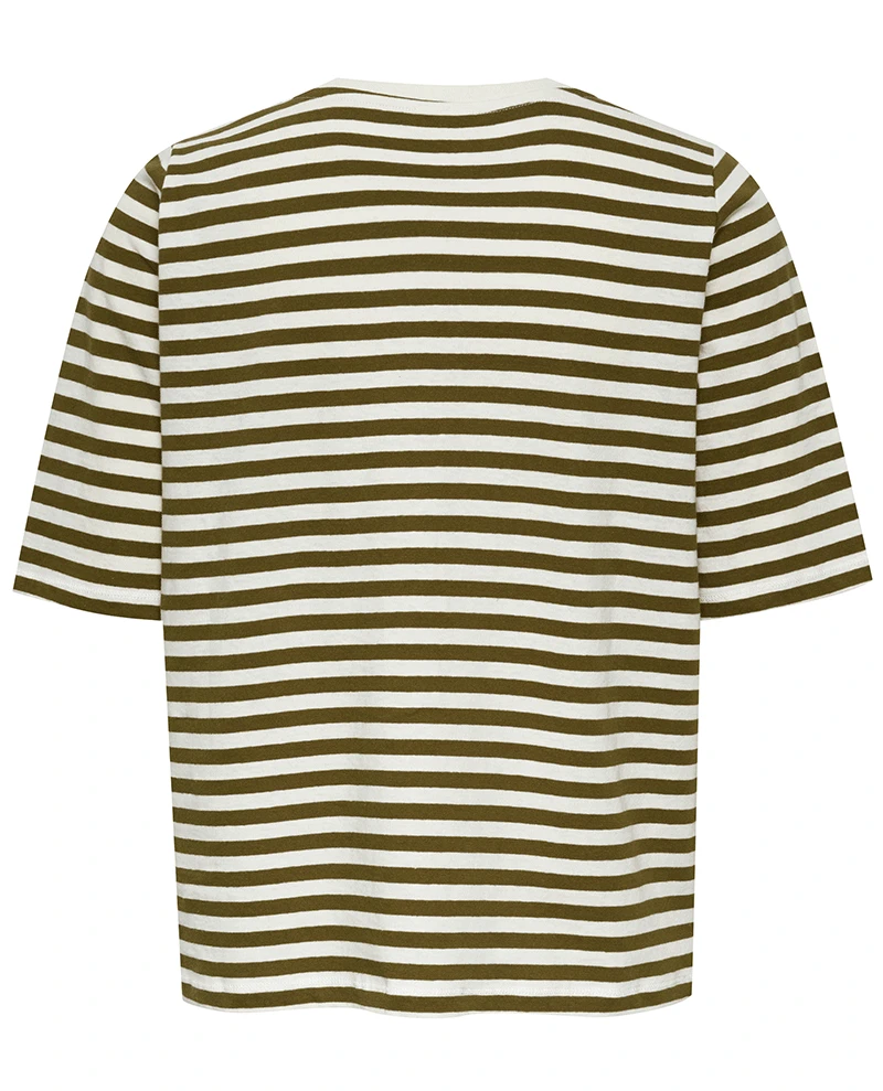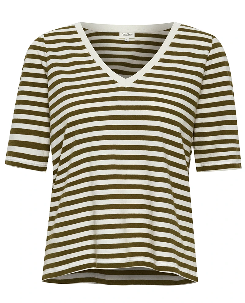 Part Two Bennie Capers Stripe T-Shirt, a short sleeved white and khaki green basic tee with a v neck and a relaxed fit. Light weight for all year round wear, this casual t-shirt also comes in plain white.