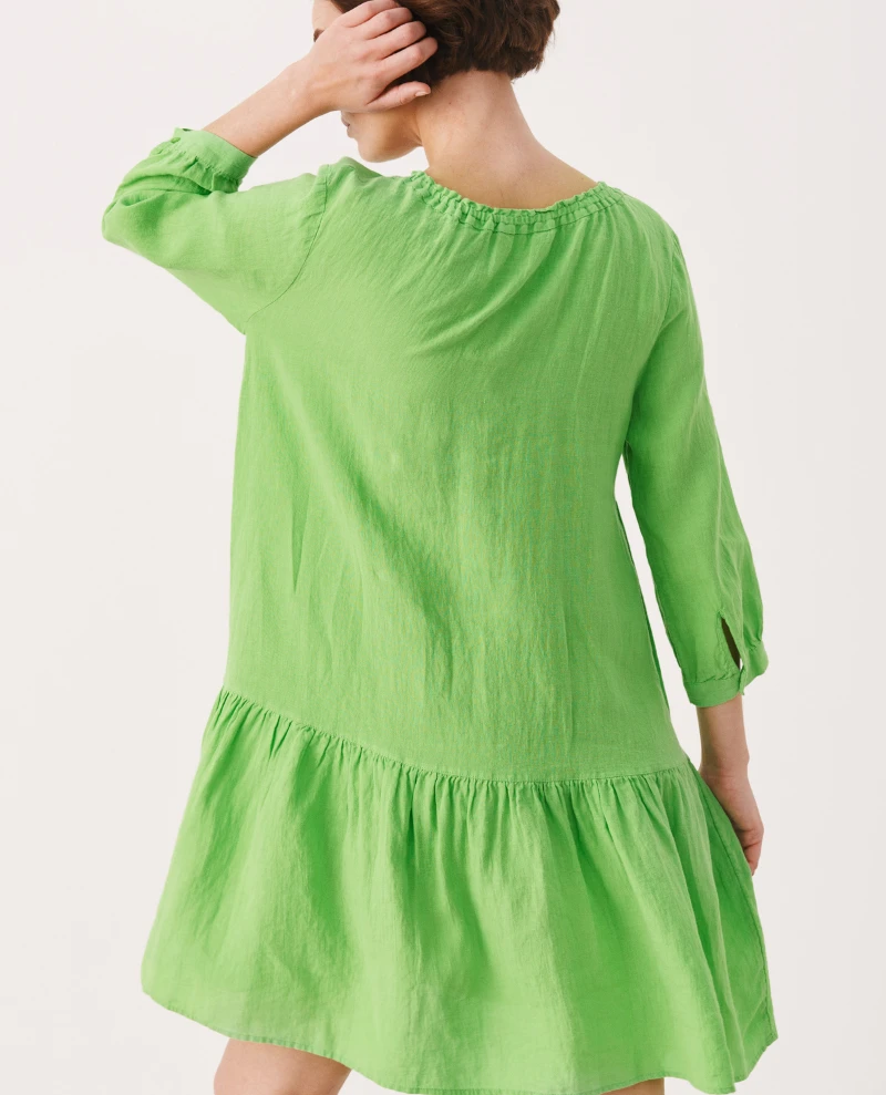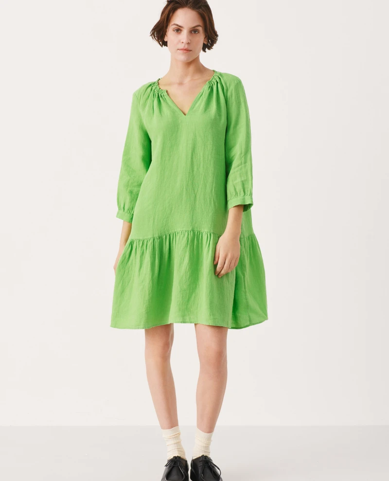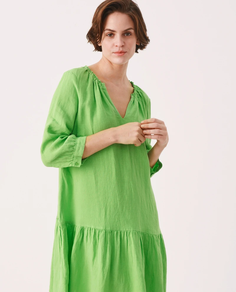 Part Two Chania Green Dress, a vibrant green dress with tiered finish. Falling around knee-length, the Chania has loose, cuffed sleeves and a v-neckline.