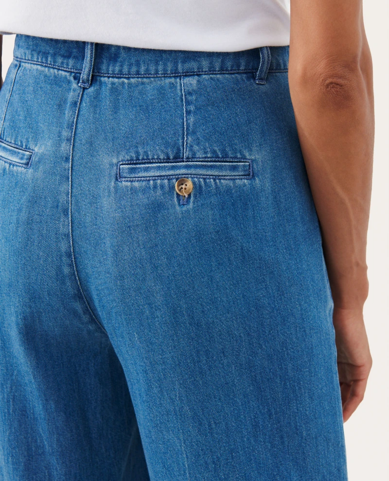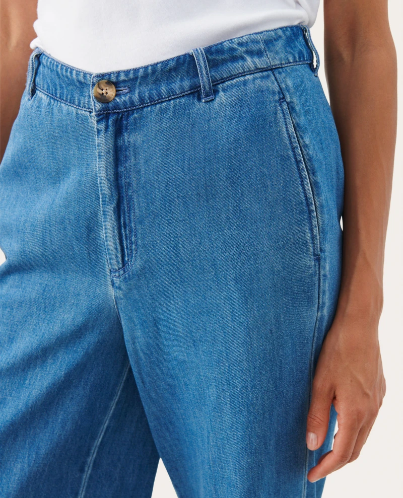 The Part Two Coralie Denim Blue Trousers are crafted from lightweight mid blue denim fabric, giving them a stylish look. The mid to high rise design and flared leg make them perfect for any occasion, while the lightweight construction ensures you stay comfortable all day.