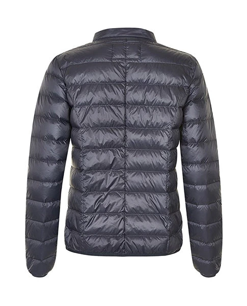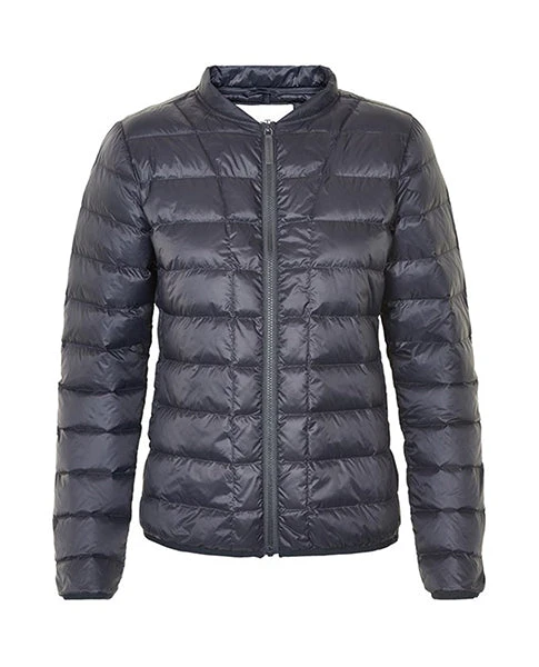 Part Two Light Ink Downie Jacket, a versatile and practical quilted navy blue jacket with a tonal plastic zip running up the front. A perennial favourite at Biscuit these padded down filled jackets squish down to nothing and fit inside their own pockets which make them great for layering, traveling and carrying in your handbag.Â