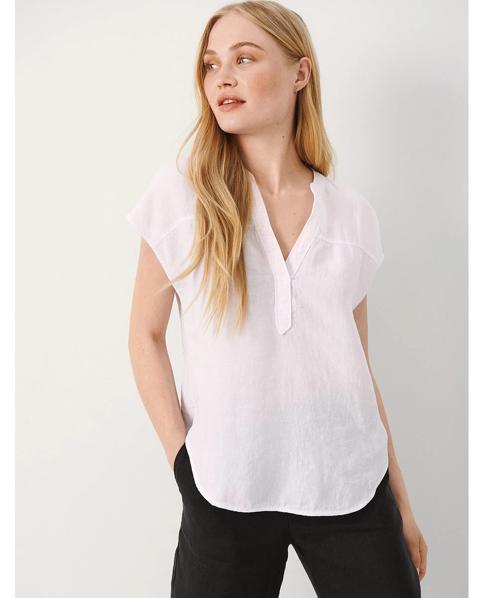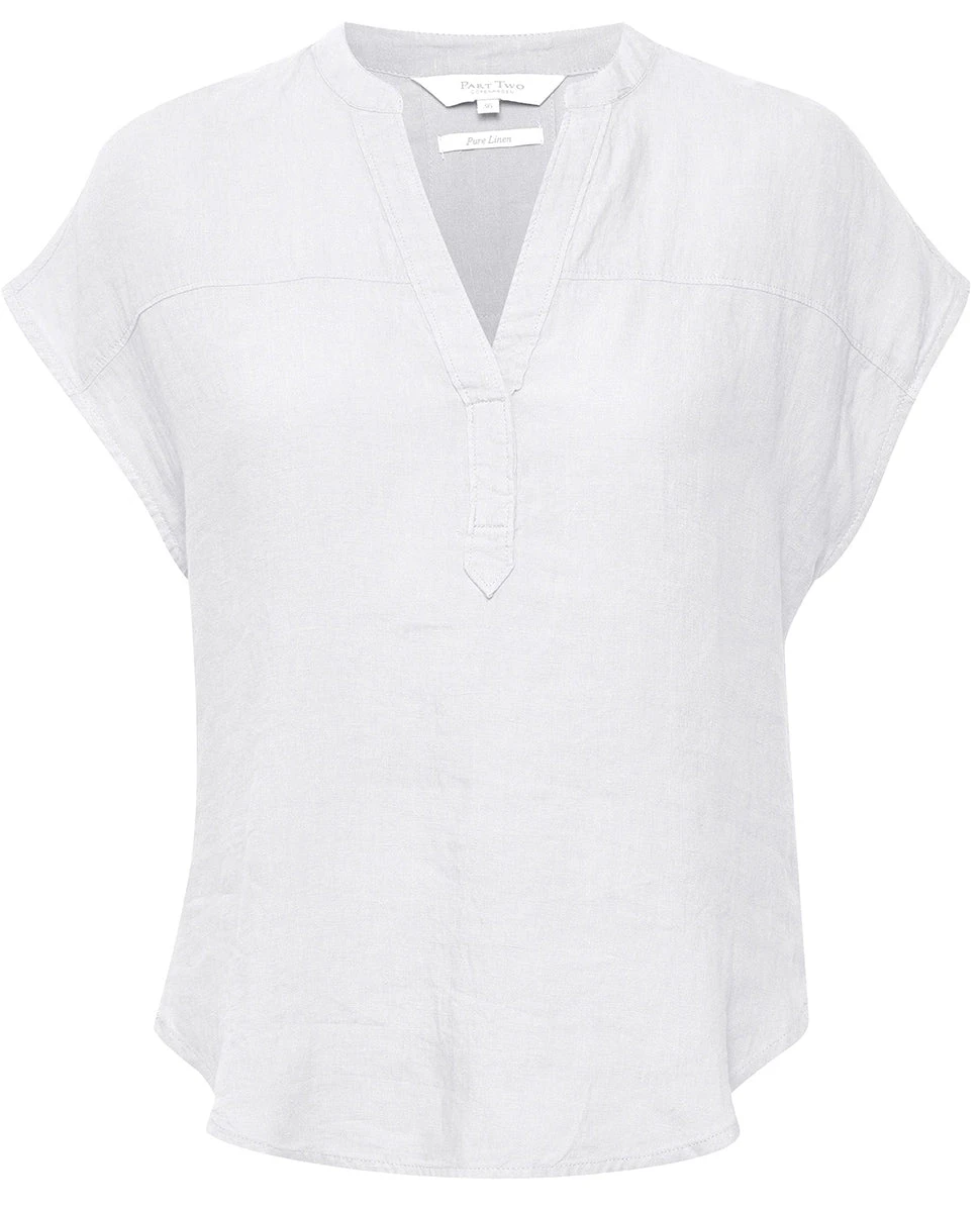 Part Two Ieva White Shirt, a bright white loose fitting linen top for Summer with short capped sleeves and a v neck. Lightweight and breathable this pure white pullover blouse has a rounded hemline and also comes in blue.