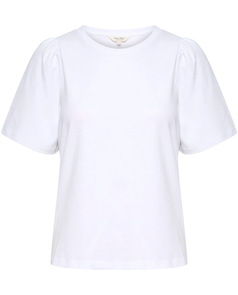 Part Two Imalea White T-Shirt, a pure white thick cotton t-shirt with short puffed sleeves and a round neck. This sustainable black cotton tee has a relaxed straight fit and also comes in black or blue. The everyday classic that every wardrobe needs.