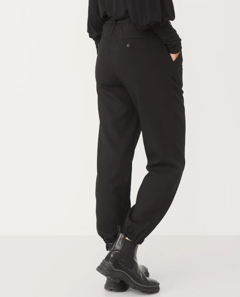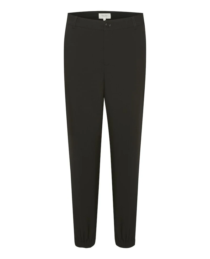 zip and Part Two Katja Black Trouser, a straight leg black trouser. In a mid rise and slim, straight leg, the Katja black trouser is finished with zip and button fastening as well as belt oops.