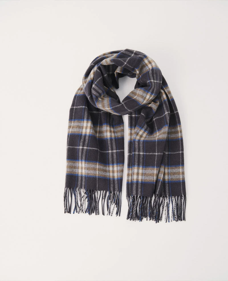 Part Two Kecita Navy Check Scarf, a classic check scarf with soft handle. In Navy and neutral check weave with decorative turned tassle finish to the edge.