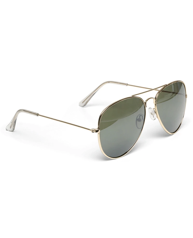 Part Two Naisha Gold Sunglasses, a golden pair of aviator sunglasses with tinted lenses. Sold in a brown leather case.Â