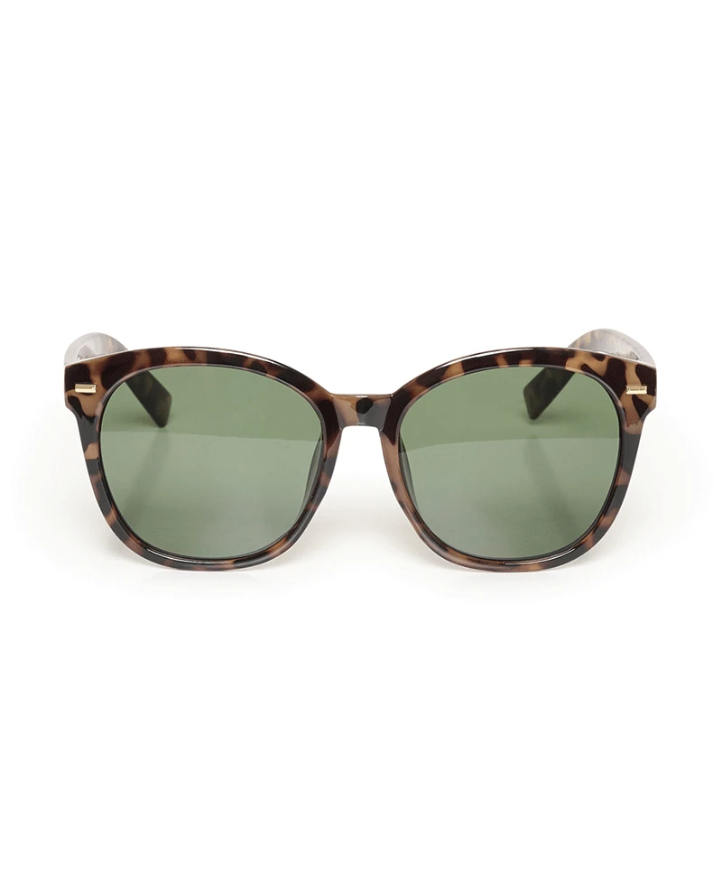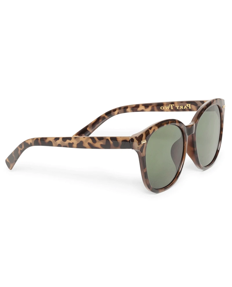 Part Two Narian Tortoise Sunglasses, a brown tortoiseshell pair of plastic glasses with tinted lenses. Comes with a brown leather case.