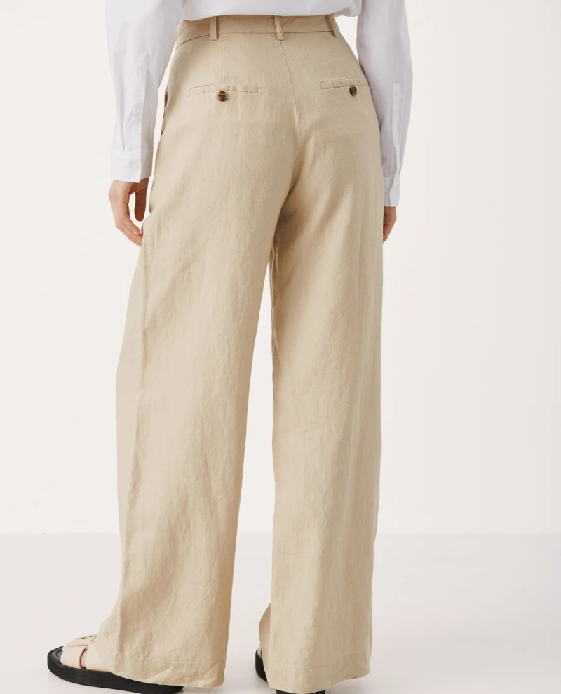 Part Two Ninnes White Pepper Trouser, a well cut linen trouser in a neutral beige. Dress up or down year round. Complete with button and zip closure, the Ninnes have a mid-rise and straight leg finish.