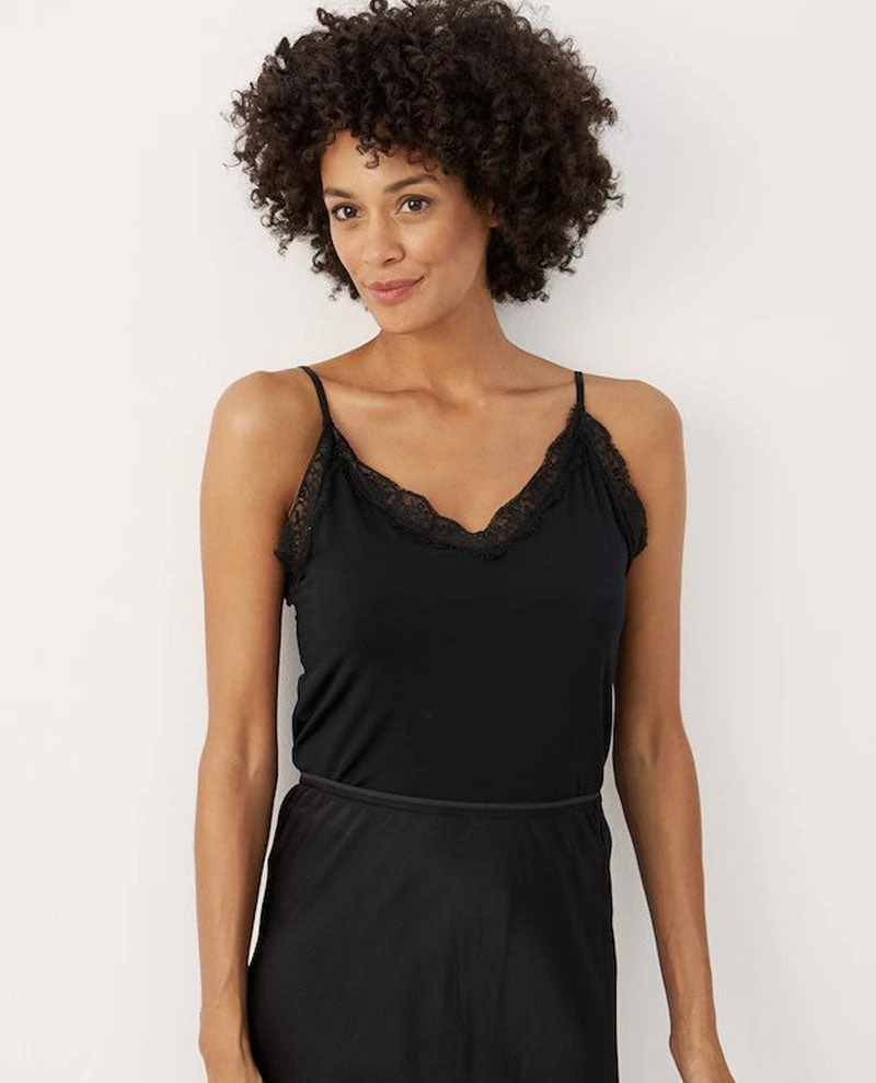 Part Two Olyvia Black Camisole, an elegant camisole with lace to the neckline. With adjustable straps, this camisole, finished in a deep black tone, is perfect beneath blazers and soft knits.