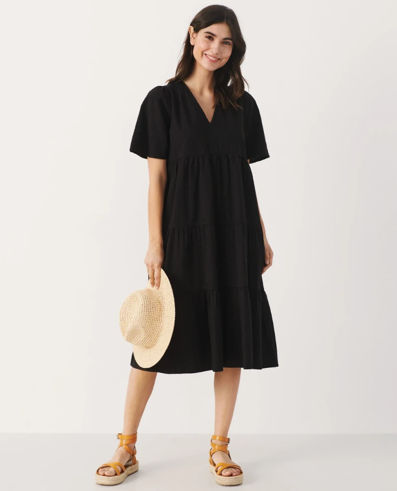 Part Two Pam Black Dress, a black tiered sundress with short sleeves and a v neck. Loose and floaty this textured seersucker midi dress falls to mid calf in length. Also available in other colours, the Pam dress will become your go to for sunny days at home and on holiday.