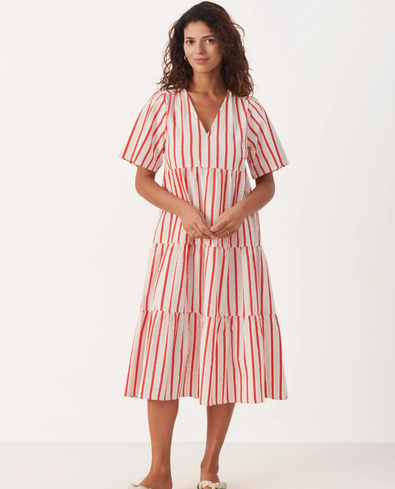 Part Two Pam Grenadine Dress, a tiered stripe sundress with short sleeves and a v neck. Loose and floaty this textured seersucker midi dress falls to mid calf in length. Also available in white and a stripe as pictured on the model, the Pam dress will become your go to for sunny days at home and on holiday.