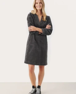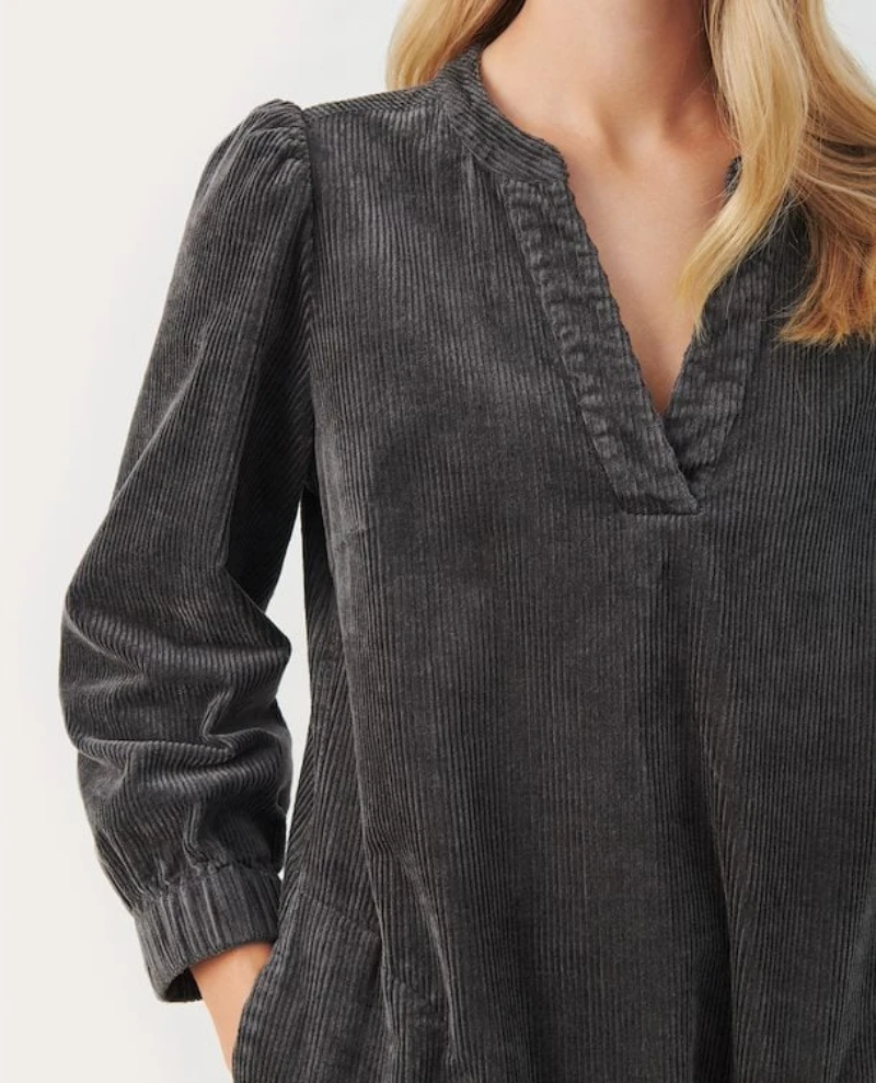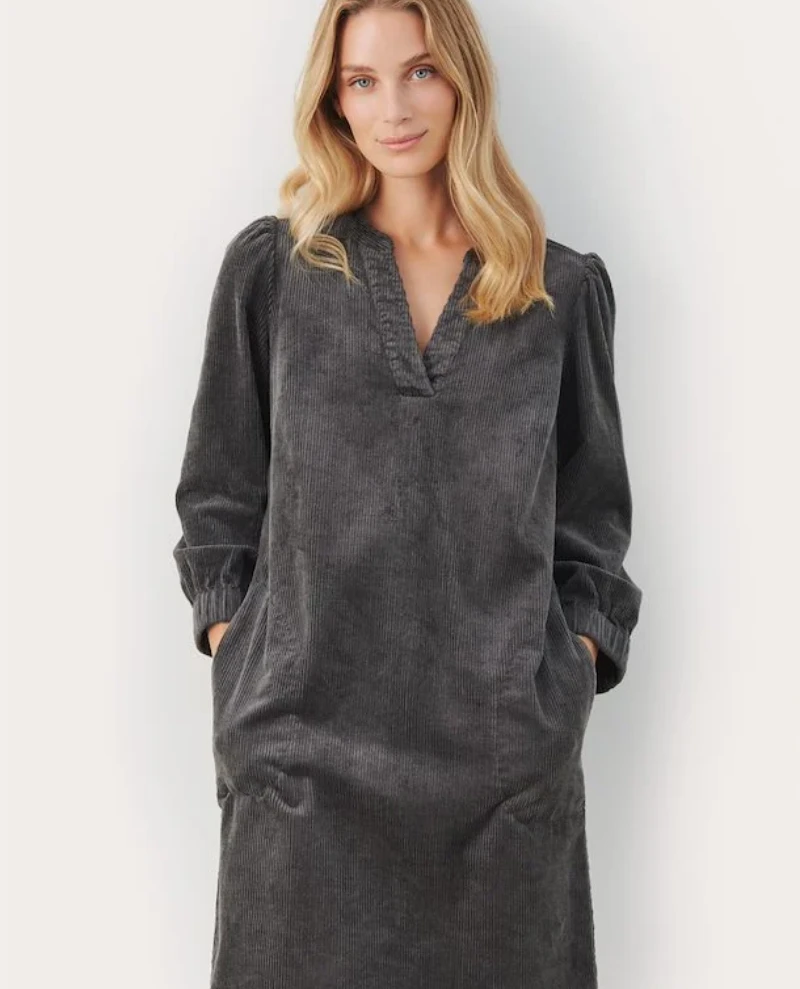 Part Two Ramita Magnet dress, a gorgeous deep grey knee length dress in chunky cord finish. Soft tp the touch with 3/4 length sleeves, the Ramita has a v-neckline and relaxed fit.