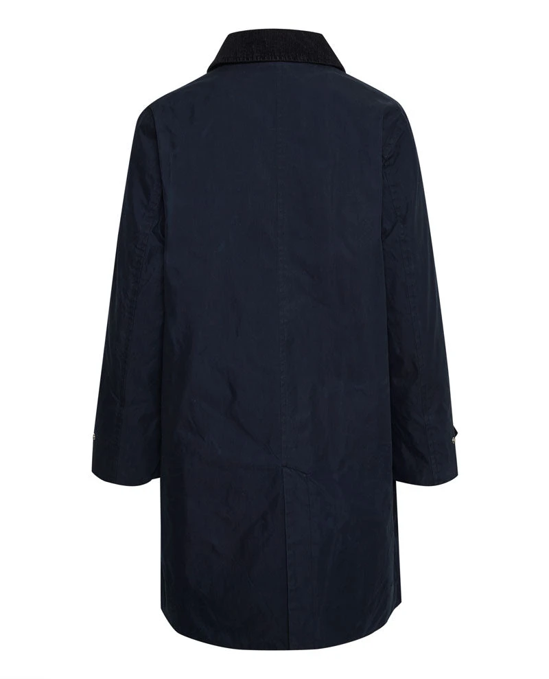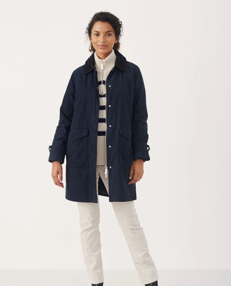 Part Two Rania Dark Navy Coat, a deep navy jacket with contrast fabric collar. With a classic silhouette, the Rania is a staple for the season. With pockets to front, zip and button closure as well as silver hardware.
