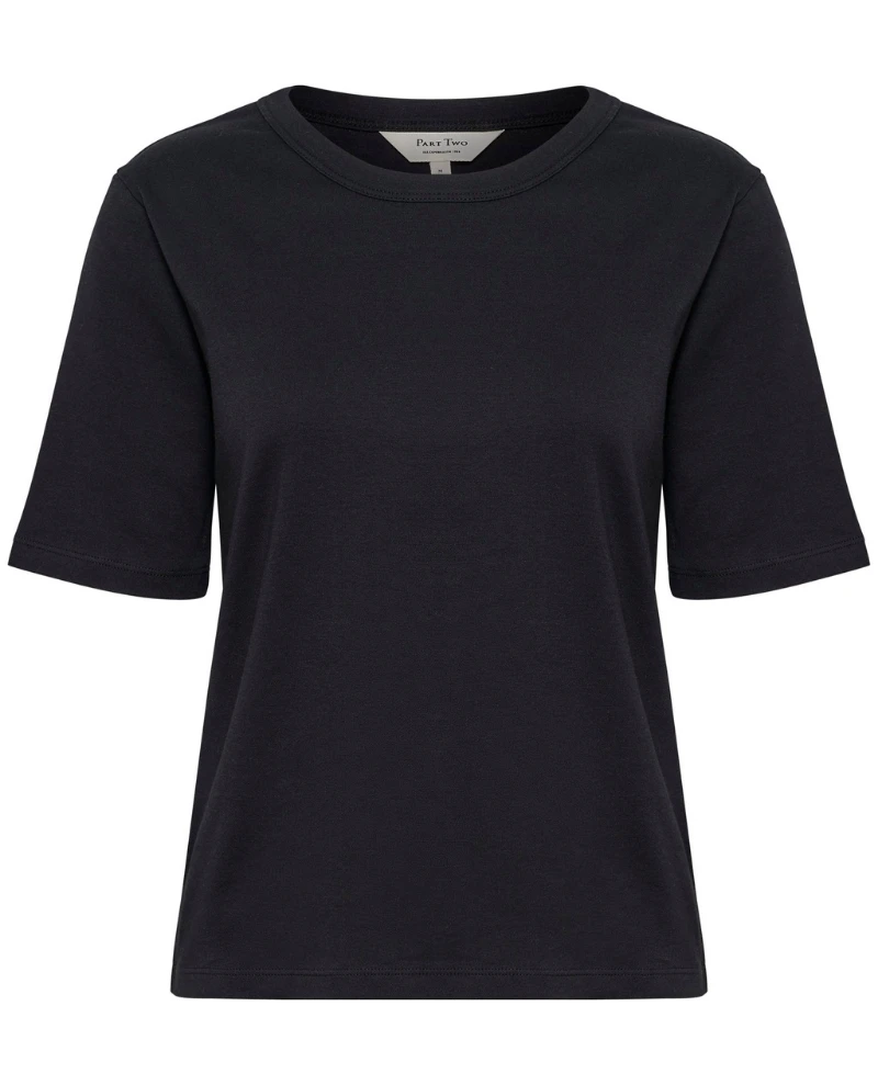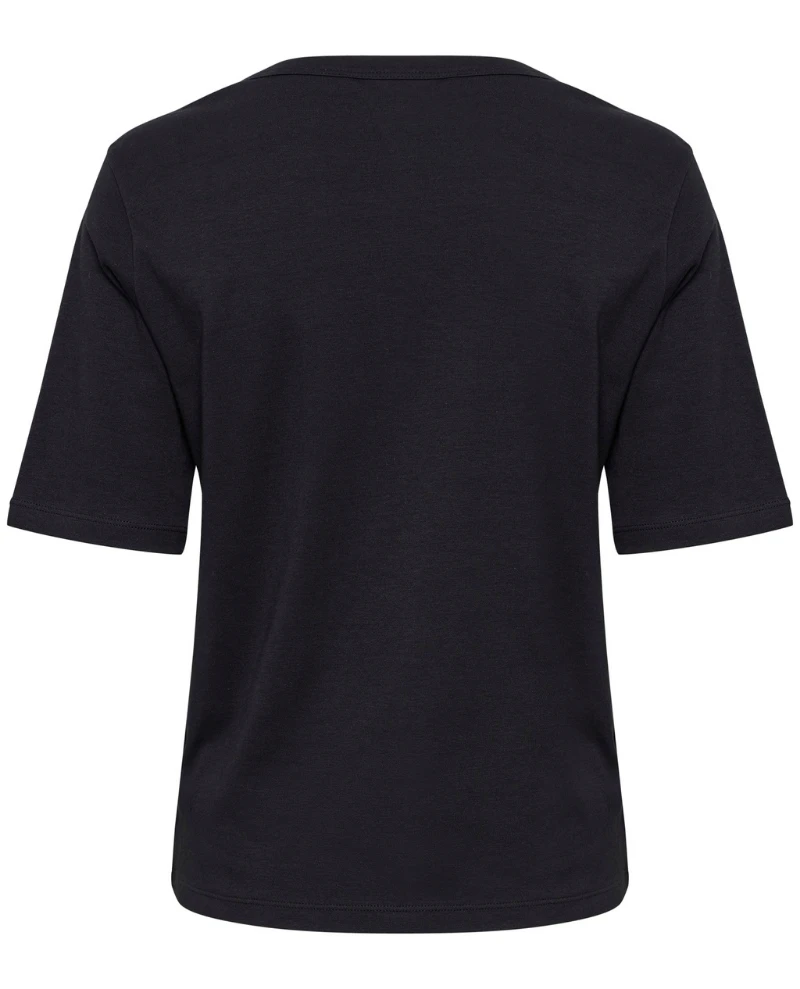 Part Two Ratana Black T-Shirt, a classic black cotton t-shirt. With a relaxed fit, the Ratana has loose half sleeves and a boxy fit. With rounded neckline, pair with your favourite denim and beneath soft knits.