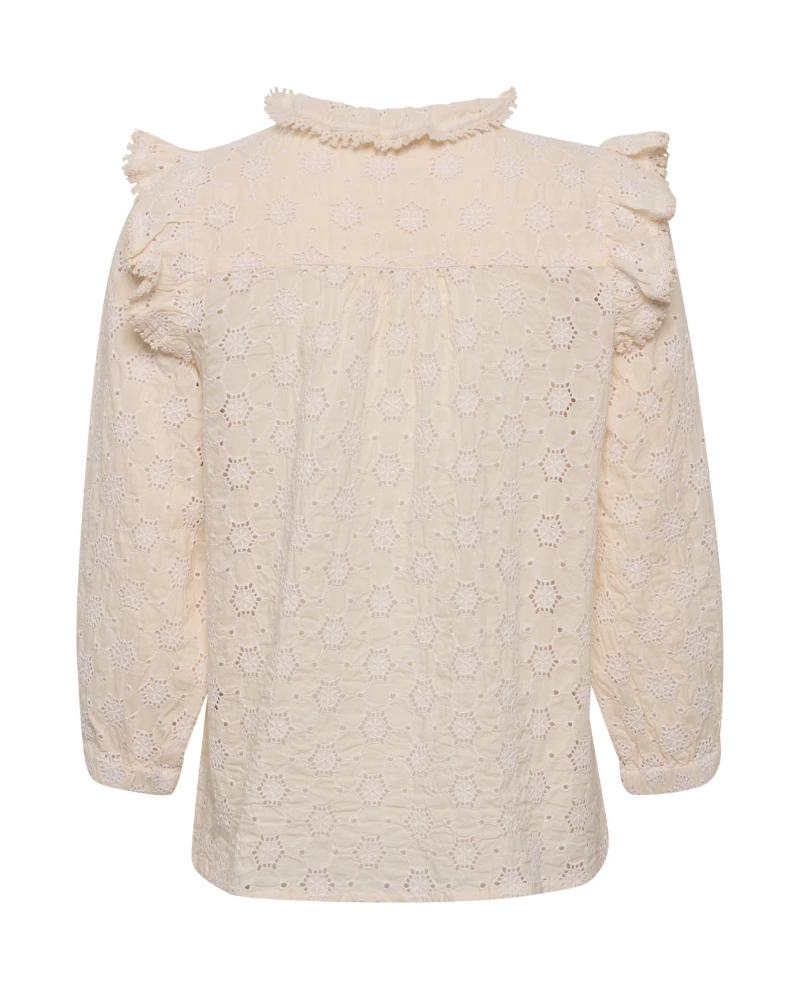 Part Two Saniya Whitecap Shirt, a warm creamy tones blouse with frill details to the neckline and shoulders. With 3/4 length sleeves and button down finish, the Saniya has a decorative look.