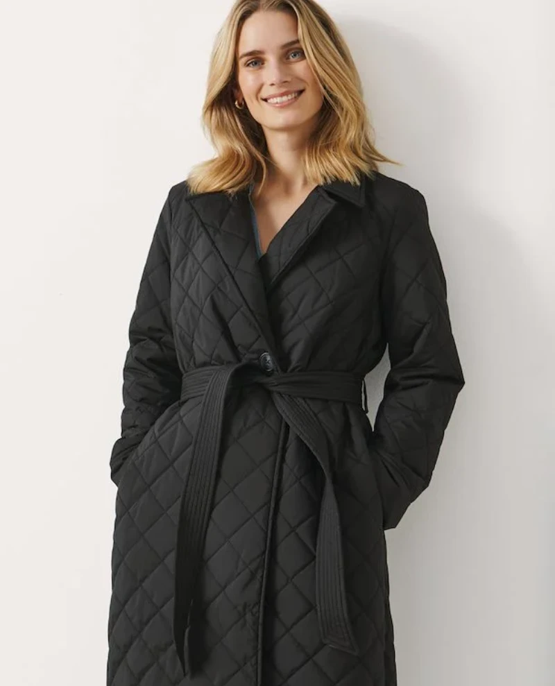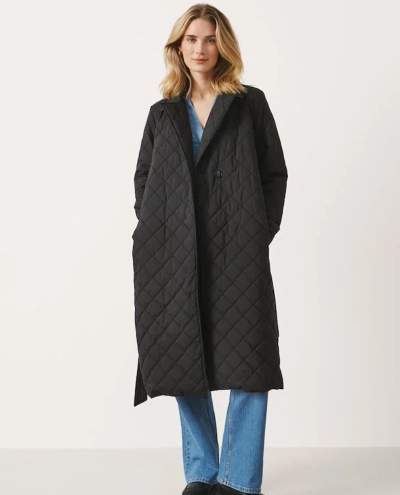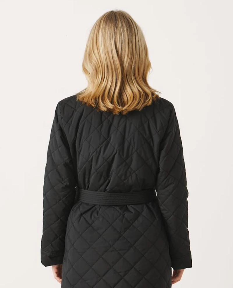 Part Two Sophie Black Jacket, a black quilted coat with wrap finish and waist belt. Made from polyester, the Sophie has a quilted finish – perfect to keep warm, also available in a rust orange finish.