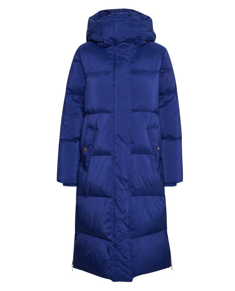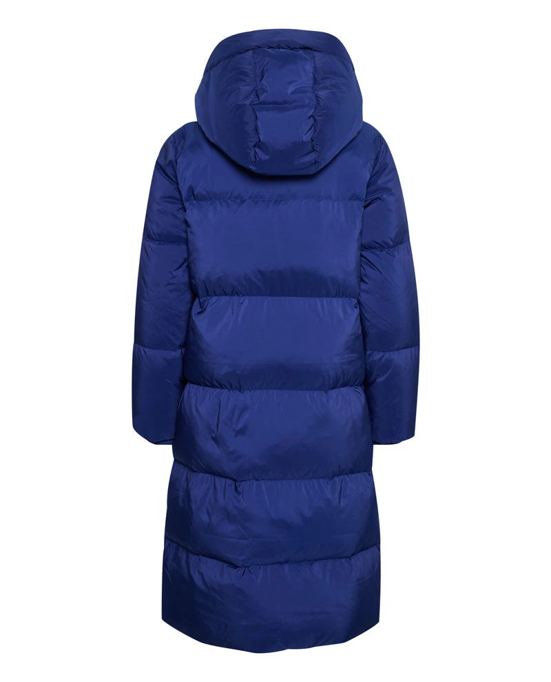 Part Two Storma Blueprint Coat, a long blue padded jacket with funnel collar and hooded finish. The Storma Coat has long sleeves, front pockets and concealed zip and button fastening.