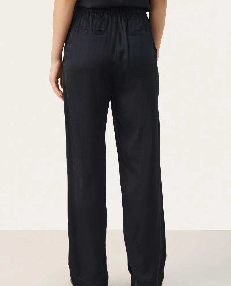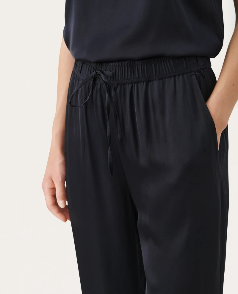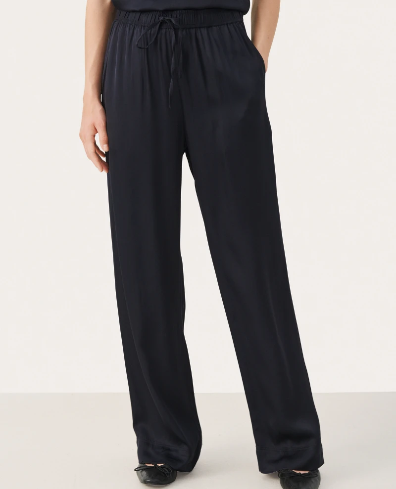 The Part Two Tiara Navy Trousers offer a modern silhouette with a silky drape and wide leg. The trousers feature a drawstring waist for a flattering fit and are perfect for a dressy, day-to-night look. Crafted in a deep navy fabric, these stylish trousers will turn heads.