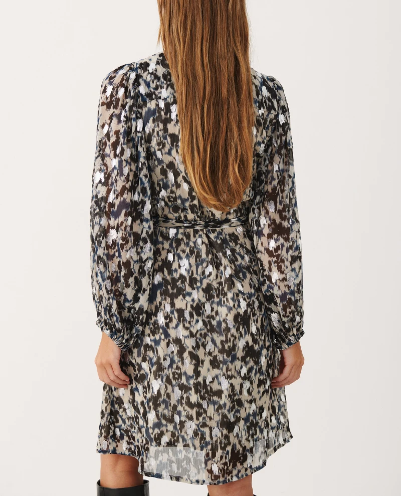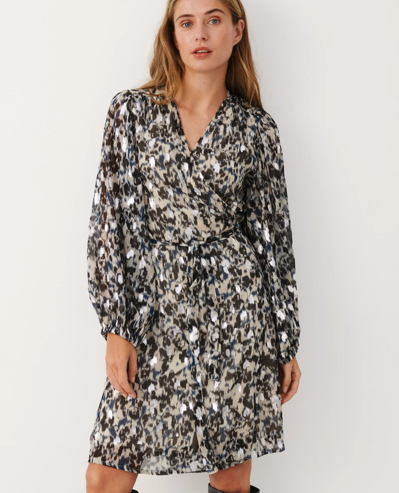 Part Two Triana Texture Silver Dress, a tonal dress with wrap style frontage. Complete with long sleeves and a pleated skirt, the Triana is finished with metallic highlights and a tie waist.