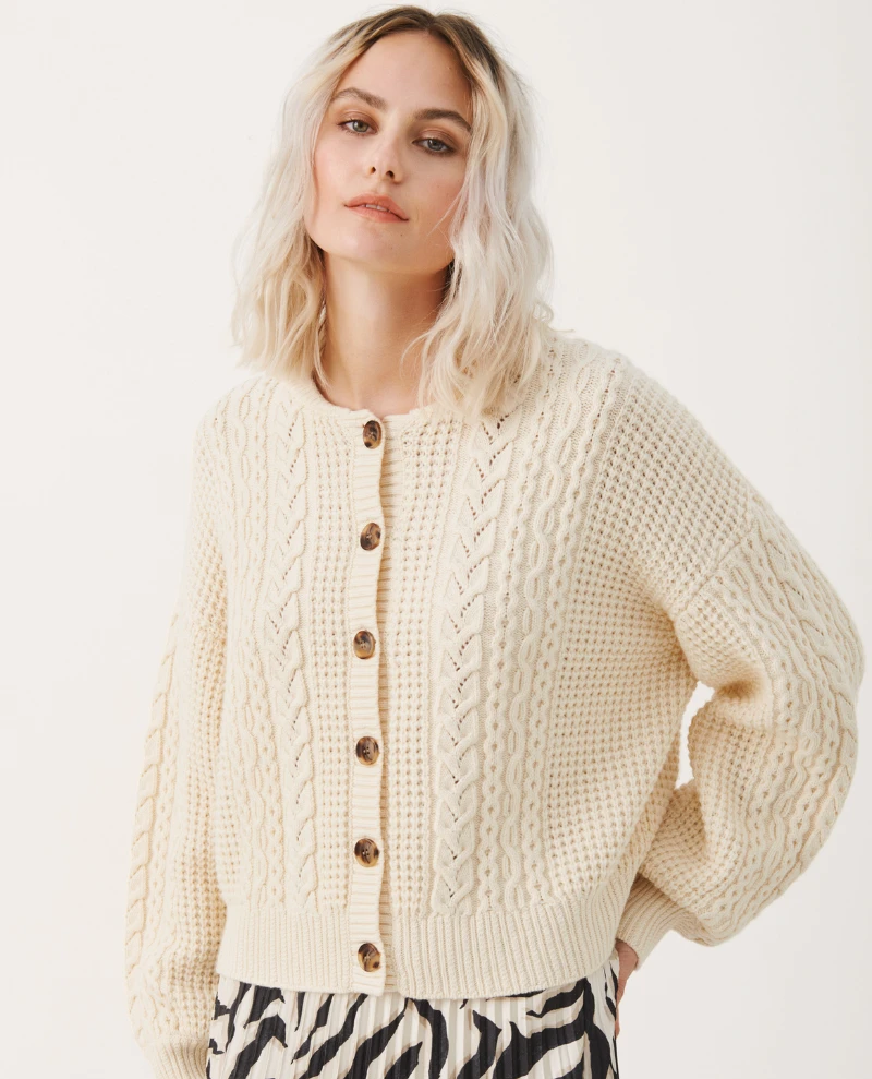Part Two Verda Cream Cardigan, a chunky cardigan in neutral cream tone. With long voluminous sleeves and a round crew neckline, the Verda has classic button down front.