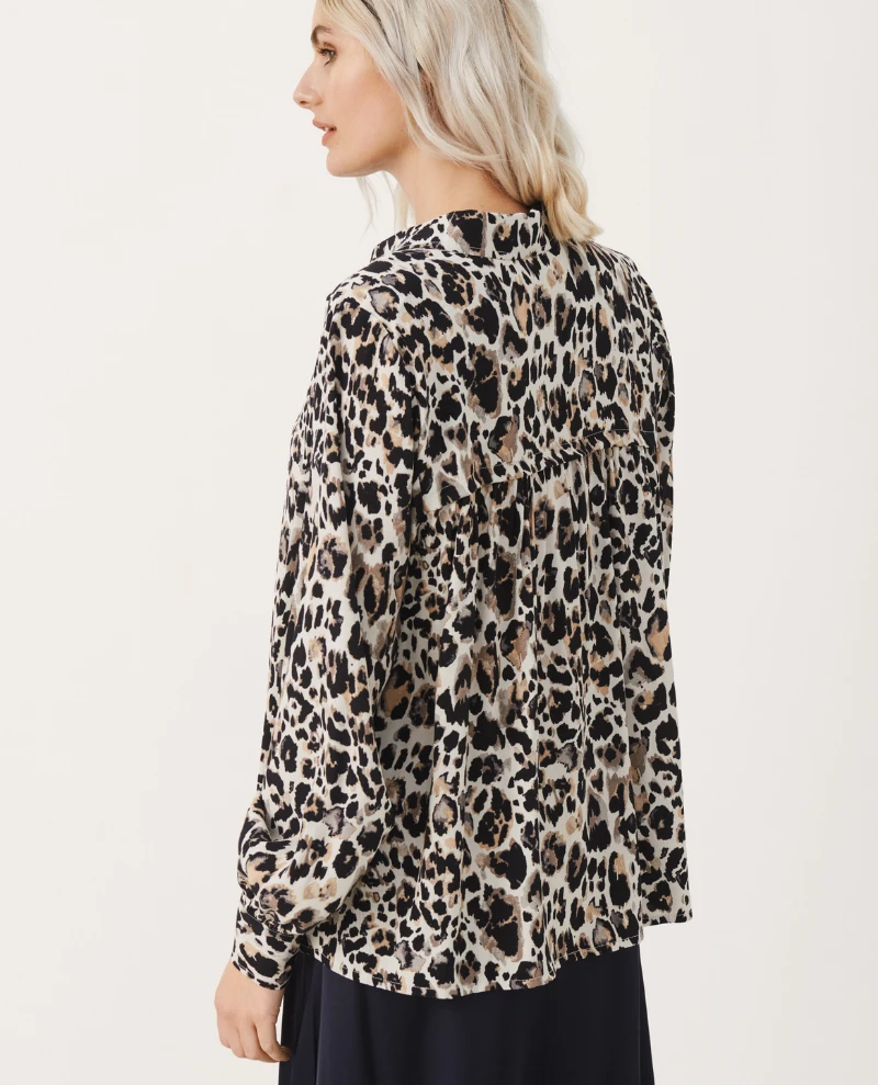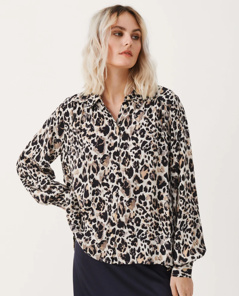 Part Two Verna Neutral Leo Shirt, a floaty shirt with classic detailing. In a neutral leopard print pattern, the Verna has long sleeves, collar and button down front. With a loose, relaxed fit.