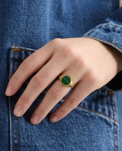 Pernille Corydon Forest Signet Ring, an elegant ring which celebrates the changes of nature with a beautiful malachite gemstone to the centre in a rich forest green. Made from gold plated recycled silver.