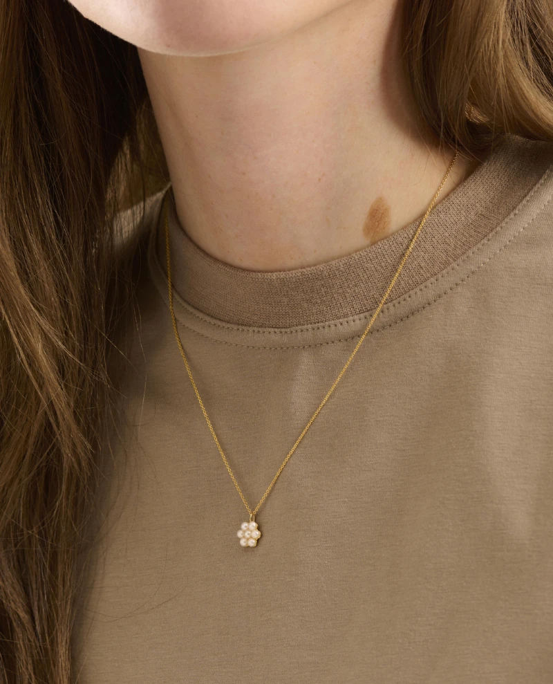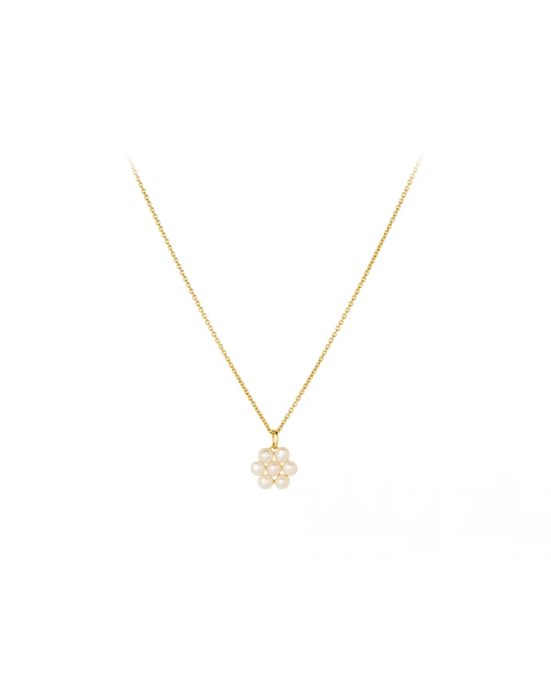 Pernille Corydon Ocean Bloom Necklace, an adjustable pendant style necklace celebrating the arrival of spring with a single floral pendant. With freshwater pearls, the Ocean Bloom necklace is made from gold plated recycled silver.