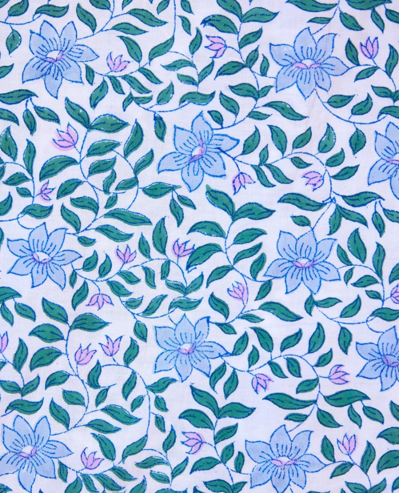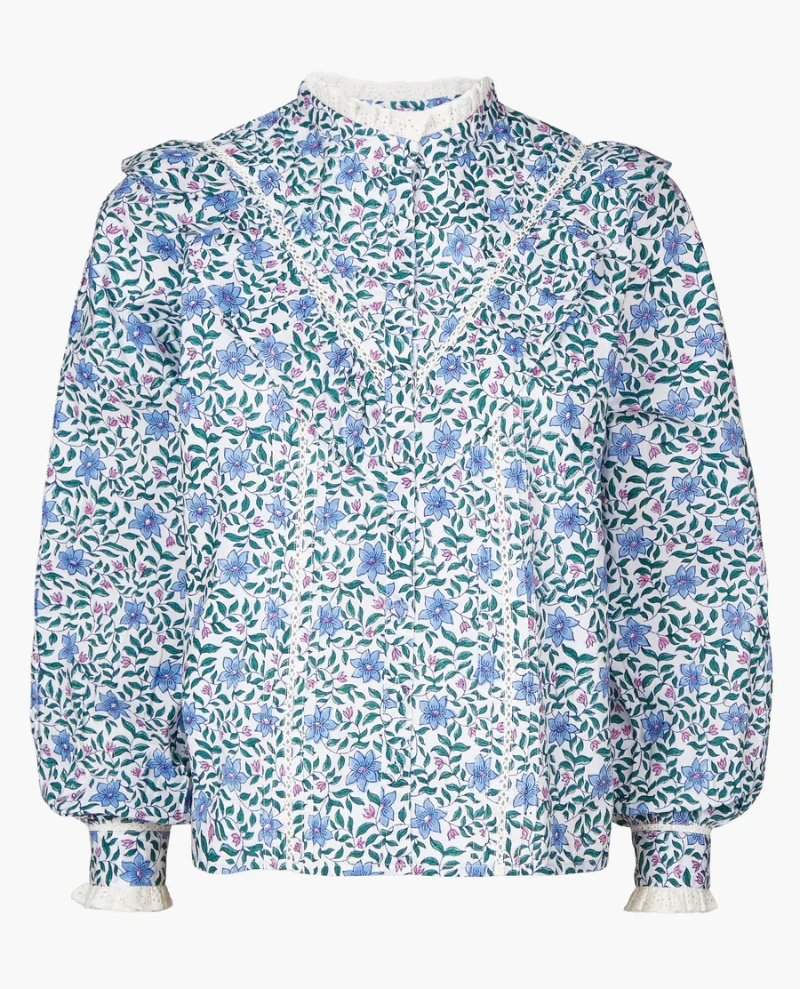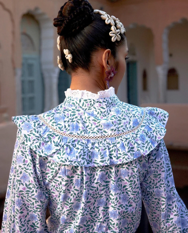 Pink City Prints Florence Sky Florentine Blouse, inspired by vintage shirts this block printed blouse features button down front with statement v-shaped ruffle and intricate lace and pin-tuck details. Style with jeans for everyday wear!
